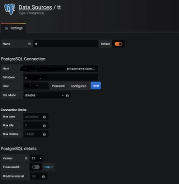 ***[02/04/2020] >>> Finally managed to connect both Grafana and the simple time-series data stored via AWS RDS PostgreSQL table. See images below for more insight. Although no analytics are being conducted yet (i.e. for train arrival forecasting), after resolving this stage, doing so will be made possible. Here's something really important to note: add the port at the END of the Host string. This is something that held my progress up for a while - simple I know - but that's perhaps the only "gotcha" part of hooking the DB up to Grafana.
